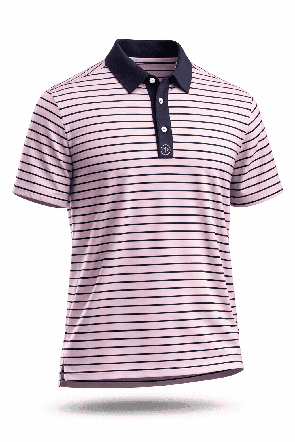 Featuring a soft pink base with clean navy horizontal stripes, a contrasting navy collar, and a structured button placket, this polo is perfect for casual wear, golf, team outings, and smart-casual occasions.