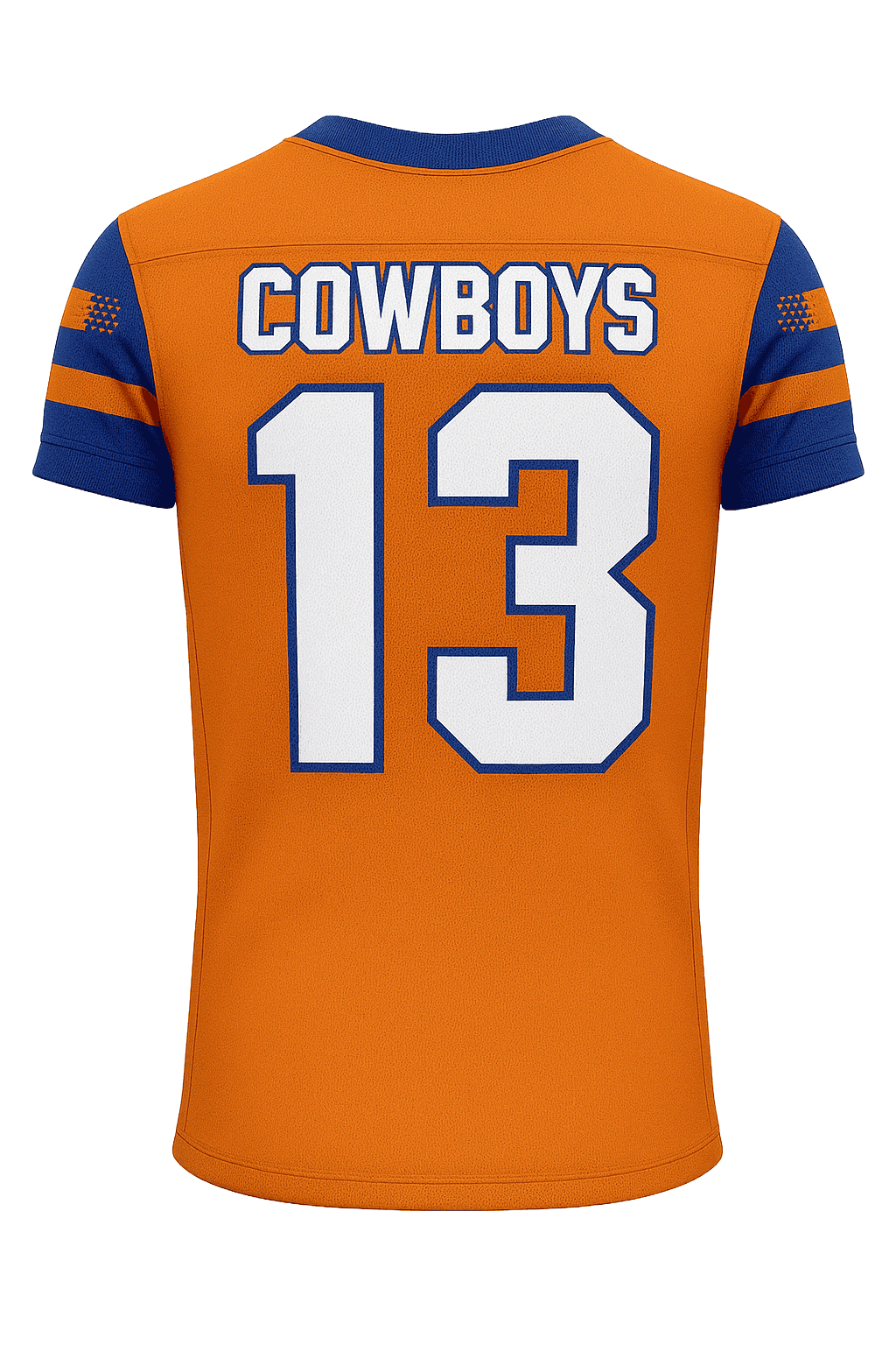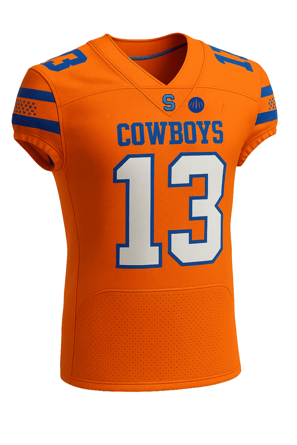 Introducing the Cowboys Jersey – where heritage meets performance. Designed for athletes who want to stand out both on and off the field, this uniform boasts a striking colorway of deep orange and royal blue with bold sleeve striping and strong number fonts. The jersey is constructed from moisture-wicking, breathable fabric that keeps players cool under pressure.